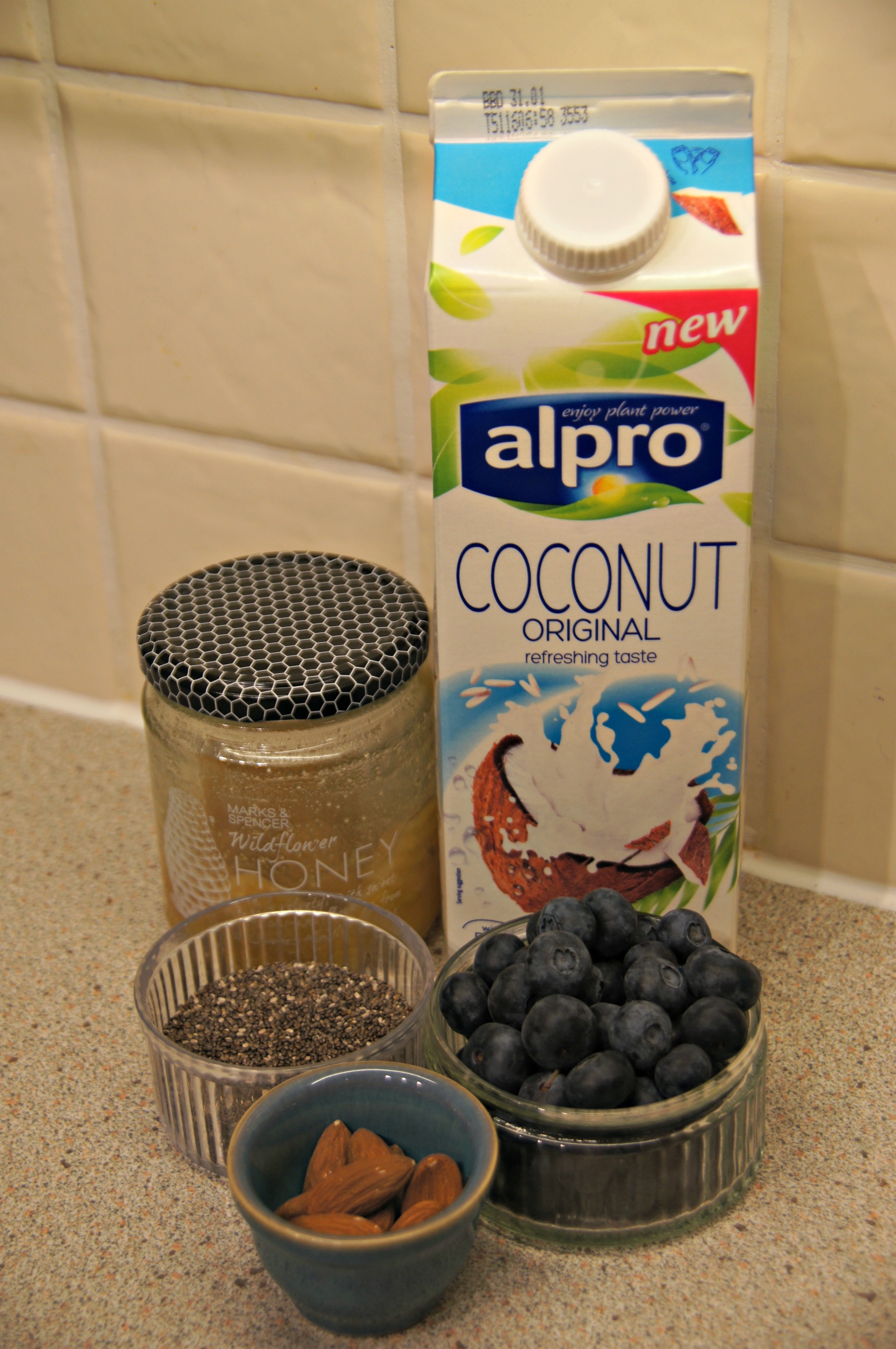 - Place the chia seeds, honey, blueberries and milk into a jam jar or bowl, stir and pop in the fridge over night.